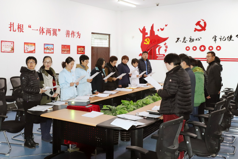 会议在全体党员齐唱入党誓词歌曲《我宣誓》的歌声中开始,“我志愿加入中国共产党,拥护党的纲领,遵守党的章程,履行党员义务,执行党的决定……”激情澎湃、振奋昂扬的歌曲,不仅严肃了庄重的会议气氛,唱出了支部党员的坚定信仰和对党组织的无限深情,也唱响了支部党员“不忘初心”、永跟党走的主旋律,鞭策和提醒支部党员不忘初心、牢记使命,自觉履行党员义务,主动肩负起新时代赋予的责任与使命。